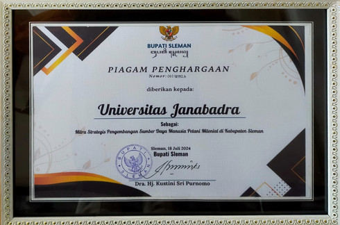 Dekan Fakultas Pertanian Universitas Janabadra, Dr. Retno Lantarsih, S.P., M.P., yang mewakili Universitas Janabadra mendapatkan penghargaan dari Bupati Sleman, Ibu Kustini, dalam sebuah kegiatan yang berlangsung di Pendopo Bupati Sleman. Penghargaan ini diberikan sebagai pengakuan atas kontribusi signifikan Dr. Retno dan Universitas Janabadra khususnya Fakultas Pertanian dalam pengembangan sumber daya manusia petani milenial di Kabupaten Sleman.